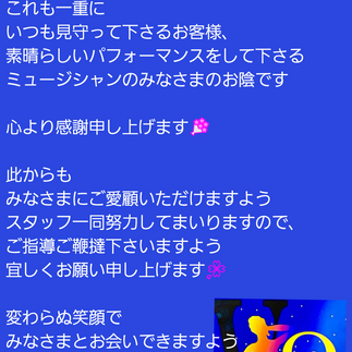 音楽好きな方、歌手目指している方、お話好きな方、一流MusicianのStageを感じながら働いてみませんか?
